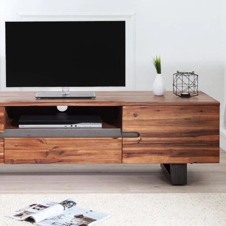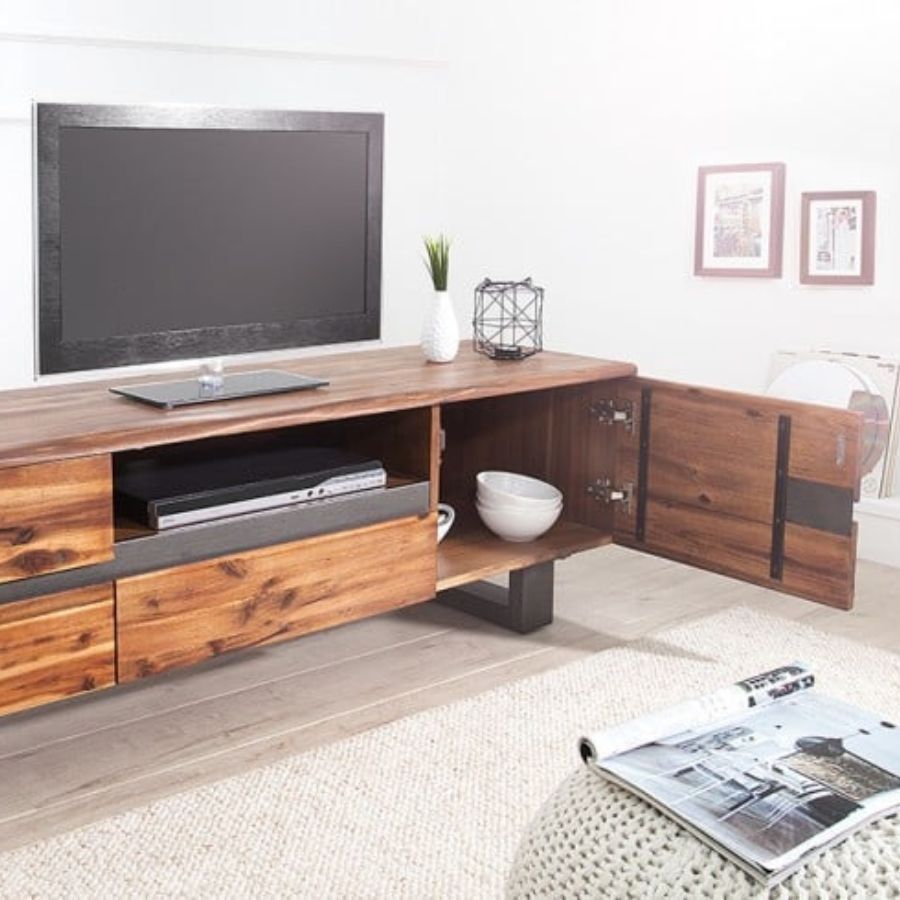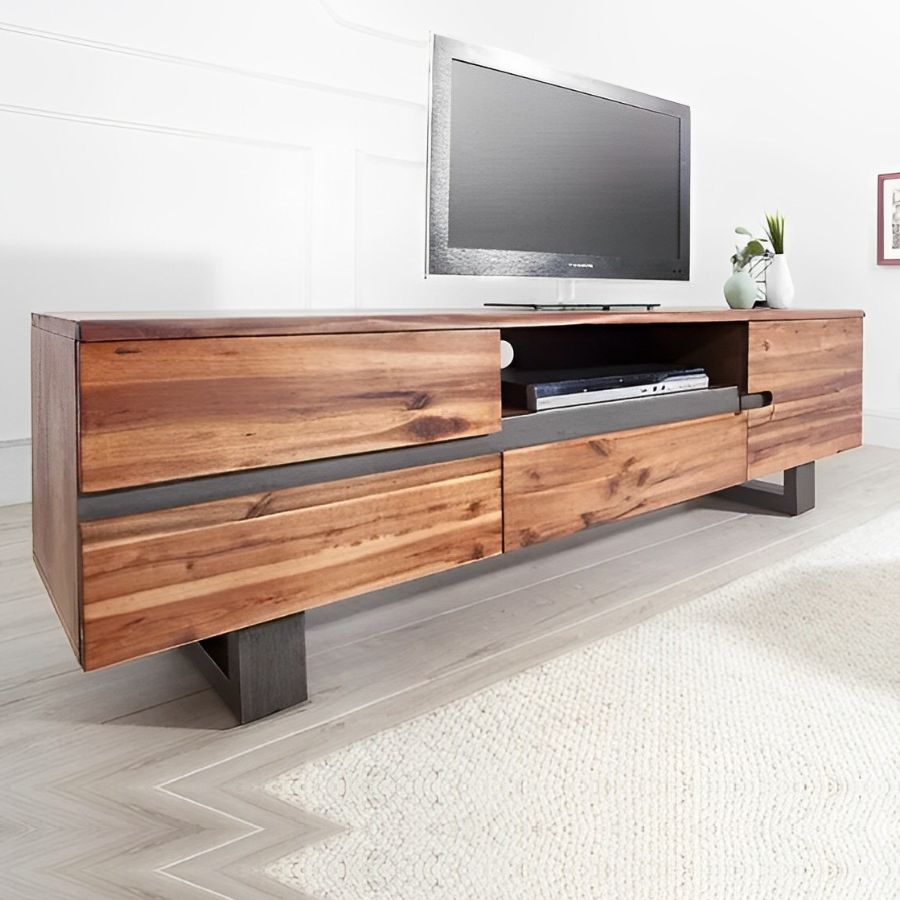 The solid TV board is made of high-quality acacia wood. As a highlight, the edges of the board have been processed in such a way that the original character and natural impression of a huge acacia tree is created. In combination with the high-quality gray skid frame in industrial finish, the lowboard will become a real eye-catcher in your home.