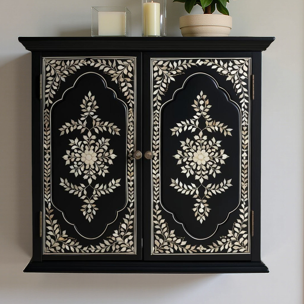Enhance your home with the exquisite charm of this Bone Inlay Wall Cabinet, a stunning blend of traditional craftsmanship and modern functionality. Handcrafted by skilled artisans, the cabinet features intricate bone inlay patterns set against a contrasting background, creating a visually striking piece that serves as both storage and art.