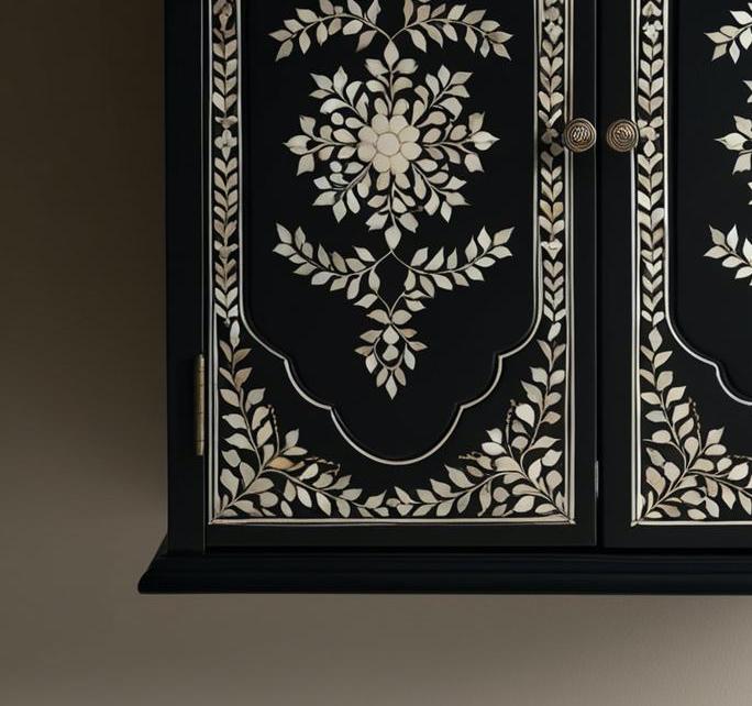 Each cabinet is one-of-a-kind, with unique variations in the bone inlay that reflect the care and craftsmanship behind every piece.